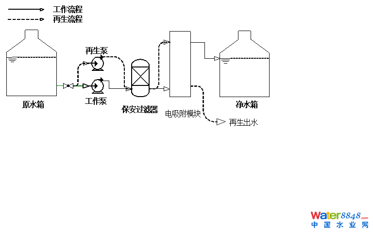 工作流程:原水通過(guò)提升泵被打入保安過(guò)濾器,固體懸浮物或沉淀物在此道工序被截流,水被送入電吸附模塊,水中溶解性的鹽類(lèi)被吸附,水質(zhì)被凈化。