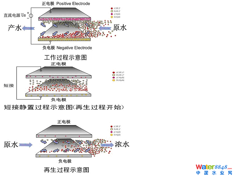 短接靜置:在電極表面吸附的離子達(dá)到或接近飽和時(shí),此時(shí)的出水可能已經(jīng)不能滿(mǎn)足要求,這就需要對(duì)電極進(jìn)行再生,再生時(shí)先要對(duì)電極進(jìn)行短接放電,此過(guò)程就是把工作時(shí)吸附的陰陽(yáng)離子重新從電極上脫附下來(lái);