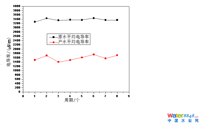 由上可知,項(xiàng)目調(diào)試階段運(yùn)行基本穩(wěn)定,在原水平均電導(dǎo)率為3367μS/cm的情況下,產(chǎn)水電導(dǎo)率的平均值為1590μS/cm,去除率為52.7%,大于項(xiàng)目設(shè)計(jì)的去除率達(dá)到45%以上的基本目標(biāo)。