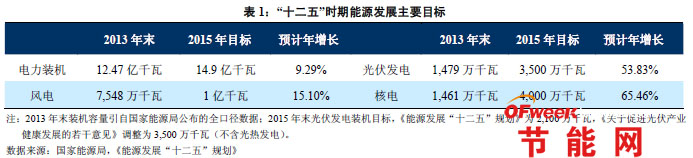 根據(jù)能源發(fā)展“十二五”規(guī)劃,到2015年我國(guó)電力裝機(jī)容量將達(dá)到14.9億千瓦,其中,風(fēng)電、太陽(yáng)能和核電的裝機(jī)容量分別達(dá)到10,000萬(wàn)千瓦、3500萬(wàn)千瓦和4000萬(wàn)千瓦。