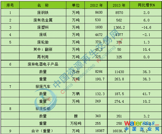 截止到2013年底,我國廢鋼鐵、廢有色金屬、廢塑料、廢輪胎、廢紙、廢棄電器電子產(chǎn)品、報廢汽車、報廢船舶等八大類別的主要再生資源回收總量約為1.60億噸,同比下降0.2%。其中,降幅最大的是廢塑料,同比下降14.6%;增幅最大的廢棄電器電子產(chǎn)品,同比增長38.3%。