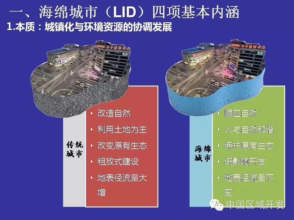 海綿城市的本質(zhì)是改變傳統(tǒng)城市建設(shè)理念,實(shí)現(xiàn)與資源環(huán)境的協(xié)調(diào)發(fā)展。在“成功的”工業(yè)文明達(dá)到頂峰時(shí),人們習(xí)慣于戰(zhàn)勝自然、超越自然、改造自然的城市建設(shè)模式,結(jié)果造成嚴(yán)重的城市病和生態(tài)危機(jī);而海綿城市遵循的是順應(yīng)自然、與自然和諧共處的低影響發(fā)展模式。傳統(tǒng)城市利用土地進(jìn)行高強(qiáng)度開發(fā),海綿城市實(shí)現(xiàn)人與自然、土地利用、水環(huán)境、水循環(huán)的和諧共處;傳統(tǒng)城市開發(fā)方式改變了原有的水生態(tài),海綿城市則保護(hù)原有的水生態(tài);傳統(tǒng)城市的建設(shè)模式是粗放式的,海綿城市對(duì)周邊水生態(tài)環(huán)境則是低影響的;傳統(tǒng)城市建成后,地表徑流量大幅增加,海綿城市建成后地表徑流量能保持不變。因此,海綿城市建設(shè)又被稱為低影響設(shè)計(jì)和低影響開發(fā)(Low impact design or development, LID)。