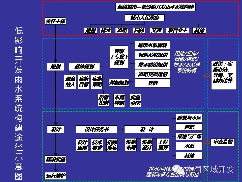 低影響開發(fā)的雨水系統(tǒng)構(gòu)建涉及到整個(gè)城市系統(tǒng),通過當(dāng)?shù)卣岩?guī)劃、排水、道路、園林、交通、項(xiàng)目業(yè)主和其他一些單位協(xié)調(diào)起來,明確目標(biāo),落實(shí)政策和具體措施,見圖5