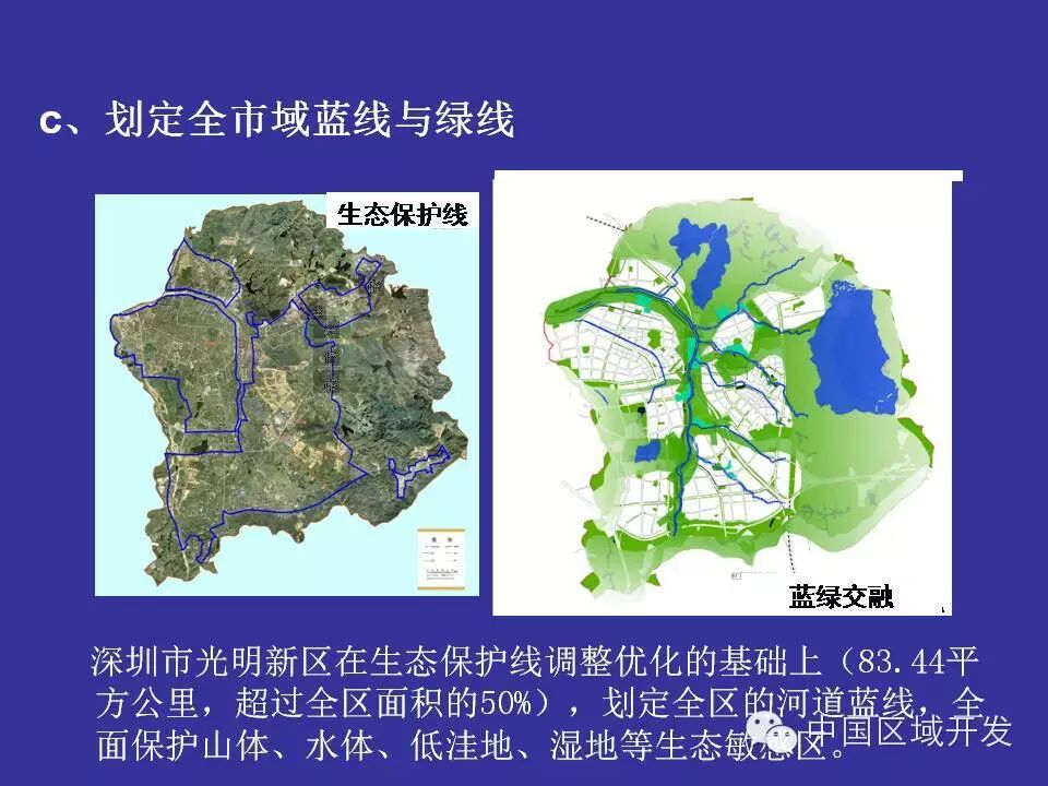 第三,劃定全規(guī)劃區(qū)的藍(lán)線與綠線。以深圳光明新區(qū)為例,作為國(guó)家級(jí)的生態(tài)城示范區(qū),光明新區(qū)規(guī)劃區(qū)范圍之內(nèi)嚴(yán)格實(shí)施藍(lán)線和綠線控制,保護(hù)重要的坑塘、濕地、園林等水生態(tài)敏感地區(qū),維持其水的涵養(yǎng)性能。同時(shí),在城鄉(xiāng)規(guī)劃建設(shè)過程中,實(shí)現(xiàn)寬廣的農(nóng)村原野和緊湊的城市和諧并存,人與自然和諧共處,這是實(shí)現(xiàn)可持續(xù)發(fā)展重要的、甚至是唯一的手段。