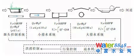 此外,還可從城市雨洪控制利用各子系統(tǒng)中的控制目標(biāo)來分析調(diào)蓄系統(tǒng)的構(gòu)成,即,由具有徑流總量和污染控制、雨水利用、排水防澇峰值控制等不同功能的各種調(diào)蓄設(shè)施所組成,也是源頭LID控制系統(tǒng)、小排水系統(tǒng)、大排水系統(tǒng)的重要組成部分。通過調(diào)蓄系統(tǒng)和管渠排放系統(tǒng)的有機(jī)組合,為構(gòu)建城市良性水文循環(huán)和“海綿”城市發(fā)揮關(guān)鍵作用。