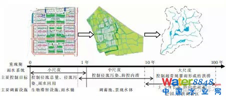 圖1 不同尺度雨水系統(tǒng)中調(diào)蓄設(shè)施構(gòu)成的城市雨洪調(diào)蓄