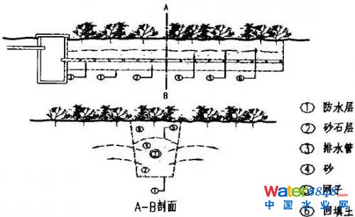 大部分雨水在收集時同時進行土壤滲濾凈化,并通過穿孔管將收集的雨水排入次級凈化池或貯存在滲濾池中;來不及通過土壤滲濾的表層水經(jīng)過水生植物初步過濾后排入初級凈化池中。