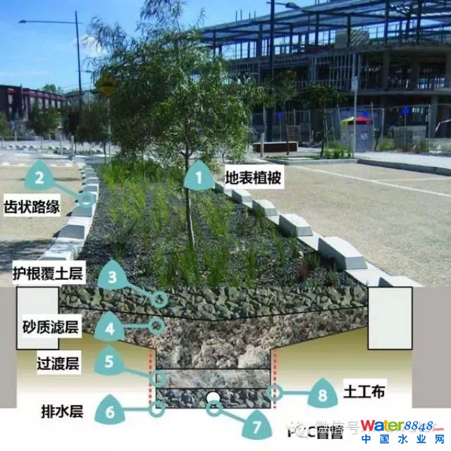 根據(jù)具體位置及路幅寬度不同,滲濾溝有以下幾種形式:①主園路滲濾溝:路幅寬6m,行人較多,雨水稍有污染,結(jié)合綠地過濾設計滲濾溝;②硬質(zhì)廣場路面:結(jié)合地面找坡及鋪裝設計,廣場中每隔20m左右設置滲濾溝;③3m寬園路:滲水磚路面+滲濾溝+穿孔集水管;④山體滲濾溝:內(nèi)側(cè)做滲濾溝,隔一定距離結(jié)合地形設置滲濾池或貯水池;⑤木棧道:棧道下方設置低洼綠地;⑥停車場:設計多孔瀝青車道結(jié)合植草磚停車區(qū),盡可能讓雨水下滲,此處雨水污染較大,結(jié)合棄流及土壤滲濾設置穿孔管集水。