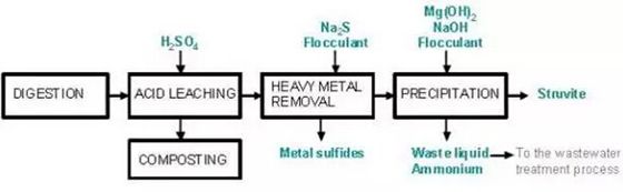 在酸浸泡階段,消化污泥與H2SO4相混合,用以降低pH。此時,重金屬和磷酸鹽就會被溶解。在此過程中,可以加入氧化劑。兩小時以后,離心機就可以將非溶解態(tài)物質(zhì)分離出來。