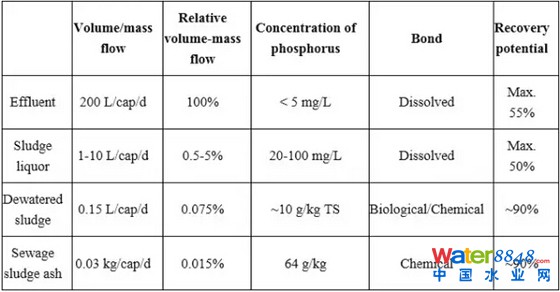 表4闡述了以上四種物質(zhì)中可回收的磷的濃度和回收率。如果污水處理工藝沒有生物或者化學除磷環(huán)節(jié),出水中磷的回收率將高達55%,只有采用了生物或者化學除磷工藝,才會在污泥或者污泥回流液中得到較高的磷回收率。