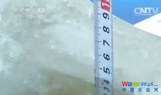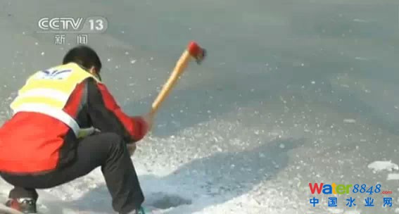 在干渠邊上,南水北調中線工程易縣段的工作人員,拿起專用工具在冰面上鑿了下去,但冰層很厚,鑿起來頗為吃力,三分鐘后,工作人員鑿出了一個長方形的冰洞。經測量冰層厚度為9厘米,冰層下的水溫為零度。