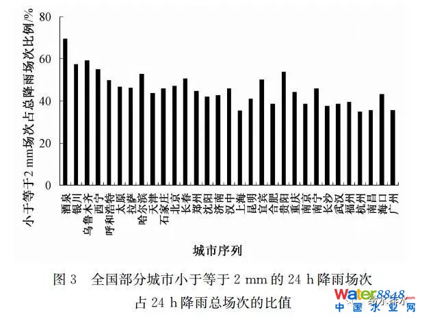 從24 h降雨場次控制率的角度上看,由于小于等于2 mm的極端小降雨事件的場次貢獻率大(31城市平均為46%),統(tǒng)計中如果保留極端小降雨事件,全國31個城市95%的24 h降雨場次控制率對應設計降雨量的減小值平均為10.6 mm,其中最大的為19.0 mm(?冢、最低為3.9 mm(拉薩);差值占比平均為25.8%,其中最大為39.1%(宜賓)、最小為17.0%(杭州)。統(tǒng)計中若不扣除極端小降雨事件將極大減小設施尺寸,降低對徑流污染物的去除效率,違背徑流源頭控制的初衷。因此在24 h降雨場次控制率的統(tǒng)計中需要扣除極端小降雨事件。