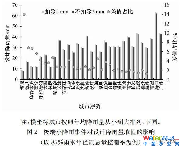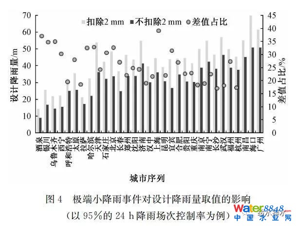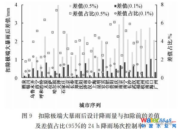 采用PERCENTILE函數(shù)統(tǒng)計法,統(tǒng)計全國部分城市扣除極端小降雨事件與不扣除極端小降雨事件下,95%的24 h降雨場次控制率對應設計降雨量的取值。計算前者與后者的差值及差值占比(差值占扣除后設計降雨量的比例)。結(jié)果顯示31個城市設計降雨量的減小值平均為10.6 mm,其中最大的為19.0 mm(?冢、最低為3.9 mm(拉薩);差值占比平均為25.8%,其中最大為39.1%(宜賓)、最小為17.0%(杭州)。