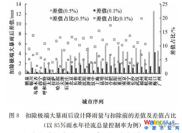 如圖8所示,統(tǒng)計全國31個城市扣除與不扣除極端大暴雨事件(末端頻率為0.5%與0.1%兩種)下,85%的雨水年徑流總量控制率對應設計降雨量取值,計算前者與后者的差值及差值占比(差值占扣除前設計降雨量的比例)。