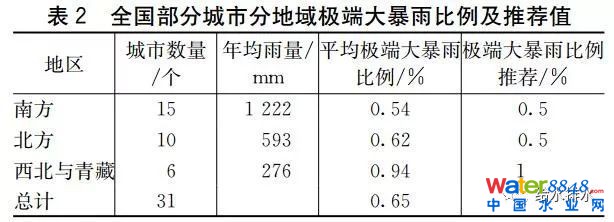 南方年均雨量大,高重現(xiàn)期降雨出現(xiàn)次數(shù)多但頻次低,極端大暴雨事件頻率平均為0.54%;北方其次,極端大暴雨事件頻率平均為0.62%;西北青藏地區(qū)盡管極端大暴雨場次數(shù)少,但由于總降雨場次數(shù)也少,極端大暴雨事件頻率最高,平均為0.94%。綜合分析全國31個城市的統(tǒng)計結(jié)果,極端大暴雨事件頻率平均為0.65%。各地域極端大暴雨推薦值見表2。
