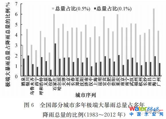 極端大暴雨事件的場次數(shù)少卻貢獻了較高的徑流總量,圖5、圖6分別統(tǒng)計了全國31個城市的多年(1983~2012年)累計的極端大暴雨總數(shù)與總量占比(極端大暴雨總量占多年降雨總量的比例)。統(tǒng)計結(jié)果表明,當以末端頻率小于0.5%的降雨事件作為極端暴雨事件,31個城市30年累計的極端大暴雨總數(shù)平均為8.8場,總量占比平均為4.5%,其中最高為6.5%(海口),最低為2.3%(拉薩);當以末端頻率小于0.1%的降雨事件作為極端暴雨事件,31城市30年累計的極端大暴雨總數(shù)平均為1.8場,總量占比平均為1.5%,其中最高為3.1%(石家莊),最低為0.6%(拉薩)。