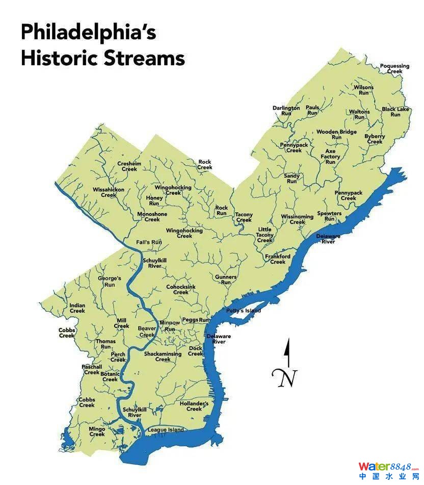 費(fèi)城是美國(guó)最老、最具歷史意義的城市之一。城市化發(fā)展所帶來的一系列問題在費(fèi)城也很明顯存在。不透水面積增加,自然水體消失退化。同時(shí)雨污合流的溢流(Combined sewer overflow),河流改變和侵蝕(Hydromodification/erosion),洪澇災(zāi)害(Flooding), 水質(zhì)惡化(Water quality)等問題都不同程度存在于費(fèi)城的四條主要河流中。
