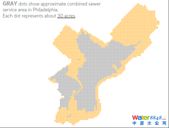 圖 費(fèi)城城市面積(黃),雨污合流面積(灰),雨污合流面積中不透水面積(黑),以及綠城清水計(jì)劃將進(jìn)行”綠畝” 改造的面積示意 (每個(gè)點(diǎn)代表30英畝)
