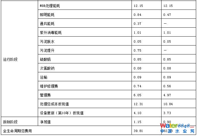 案例地下污水處理廠的建設成本單價為4 910元/(m³·d-1),地上污水處理廠為3 750元/(m³·d-1),均遠高于相同規(guī)模的普通二級污水處理廠的建設單價[1 471元/(m³·d-1)]。除地下污水處理廠額外地下空間開挖與構筑、配套設施與設備安裝(占總工程費用的23.5%)因素外,MBR工藝造價較高(占總工程費用的20.1%)是另外一個原因。