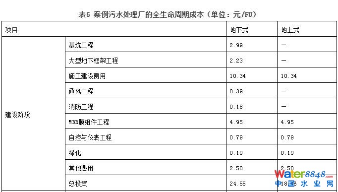 若設備使用年限設定為10年,則生命周期中共需更新1次設備。計算可知,本研究采用的折現(xiàn)率為7.84%。維護費用取固定資產(chǎn)的3%;管理費用取運行費用與固定資產(chǎn)的15%。案例污水處理廠的全生命周期成本統(tǒng)計結(jié)果列于表5?芍叵潞偷厣衔鬯幚韽S的全生命周期總成本分別為39.81、32.43元/FU,地下污水處理廠比地上污水處理廠高出22.8%?梢,無論在哪個階段,地下污水處理廠都需要投入較高的成本,不利于資金籌措、周轉(zhuǎn)與回報。