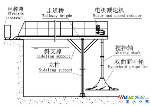 圖一為干式安裝,通過橋架將減速電機定位在水池上方,由傳動軸將動力傳遞給水下的雙曲面葉輪,傳動軸的長度根據(jù)池深而定,一般葉輪離池底約300mm。