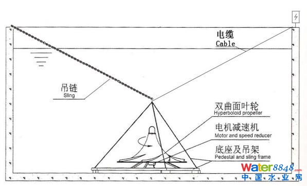 圖二為潛水式安裝,它由潛水電機、雙曲面葉輪和吊裝附件組成。利用潛水電機依靠設(shè)備自重定位,無需額外固定設(shè)施。