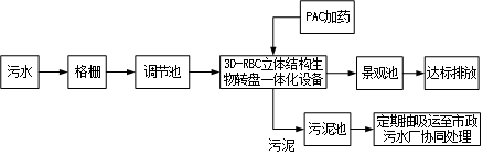 該項目各個站點比較分散,缺乏相對專業(yè)的技術(shù)運維人員,宜選用施工簡便、運維方便、自動化程度高的一體化設(shè)備。與污水處理市場上常用的生化工藝(常規(guī)活性污泥法、A/O工藝、SBR、MBR等)相比,3D-RBC立體結(jié)構(gòu)生物轉(zhuǎn)盤工藝施工周期短、操作運維簡單、單位運行成本低。結(jié)合該污水站的實際情況,最終確定選用3D-RBC立體結(jié)構(gòu)生物轉(zhuǎn)盤工藝。污水處理工藝流程見下圖。