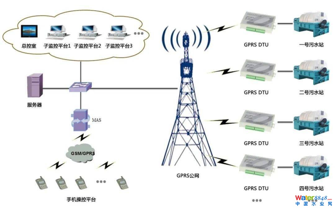 在項目運營方面,采用專業(yè)化污水處理團隊與國企聯(lián)合運維,實行鎮(zhèn)督導、村落實、運維班組實施的管理運維模式。運維團隊引入物聯(lián)網(wǎng)技術(shù)對污水站進行智能化管理,采用物聯(lián)網(wǎng)+智慧云平臺運營管理模式,通過物聯(lián)網(wǎng)和3G/4G/5G技術(shù),將生活污水處理站點數(shù)據(jù)實時傳遞到監(jiān)控室的集中監(jiān)控中心,以實現(xiàn)對系統(tǒng)的統(tǒng)一監(jiān)控和分布式管理。通過電腦或手機客戶端即可遠程監(jiān)測和調(diào)控污水處理終端的運行情況,實現(xiàn)各工藝單元設(shè)備運行數(shù)據(jù)的實時采集,保障污水站運行穩(wěn)定性,減少運維人員的日常巡檢工作。該項目的運營示意圖如下。
