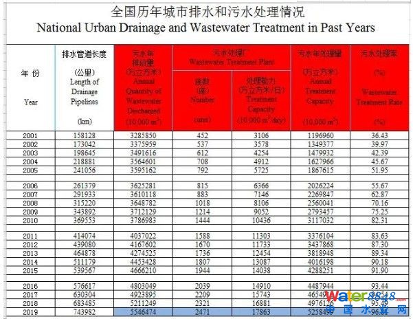 2019年,全國縣城污水年排放量為102.3億立方米,污水處理廠1669座,處理能力3587萬立方米/日,年污水處理總量為95.01億立方米,污水處理率達(dá)93.55%。 |