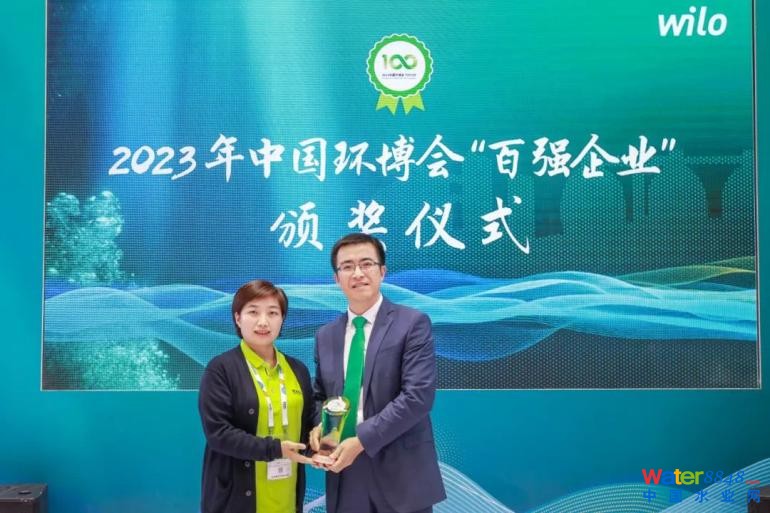 環(huán)保事業(yè)的發(fā)展中,如何降低溫室氣體排放,實(shí)現(xiàn)低碳綠色的發(fā)展?其主要的手段包括“節(jié)能”、“采用可再生能源”及“電氣化”、“智能化”,在此領(lǐng)域,威樂擅長的高效節(jié)能水泵解決方案均可發(fā)揮巨大的作用。2023年環(huán)博會上,組委會再次組織行業(yè)專家參與評審,在兩千余家參展企業(yè)中評選出百強(qiáng)企業(yè),威樂也再次獲得了這一榮譽(yù)。儀式現(xiàn)場,慕尼黑展覽徐佳女士向威樂中國銷售副總經(jīng)理陳華俊先生頒發(fā)了百強(qiáng)企業(yè)獎杯。