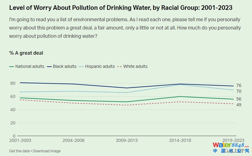 蓋洛普指出,在過去的20年里,他們一直發(fā)現(xiàn),美國人對飲用水污染的擔(dān)憂超過了其他環(huán)境問題。在其2019年至2023年進(jìn)行的年度環(huán)境民意調(diào)查中,56%的美國人總體上表示,他們“非常”擔(dān)心飲用水污染。其中,有76%的非裔成年人和70%的拉丁裔成年人表達(dá)了這種情緒,而白人成年人中只有48%的人表達(dá)了這種情緒。