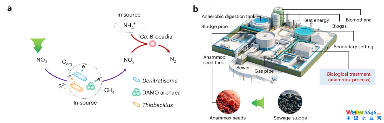 作者創(chuàng)新提出了一種硝酸鹽驅(qū)動的原位氧化策略,充分利用污泥自身釋放的還原性物質(zhì)作為電子供體(碳、硫、甲烷和氨氮),誘導驅(qū)動短程反硝化和厭氧氨氧化反應(yīng),繼而實現(xiàn)了厭氧氨氧化菌快速增殖。該策略為厭氧氨氧化種泥快速培育提供了一種高效、經(jīng)濟的新途徑,有力推進了污泥資源化利用和污水低碳高效脫氮(圖4b),助力了污水處理行業(yè)減污降碳協(xié)同增效的目標實現(xiàn)。