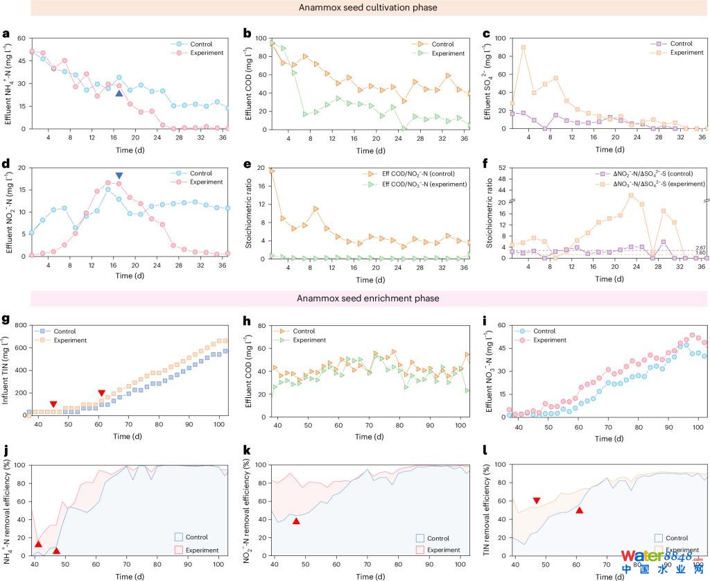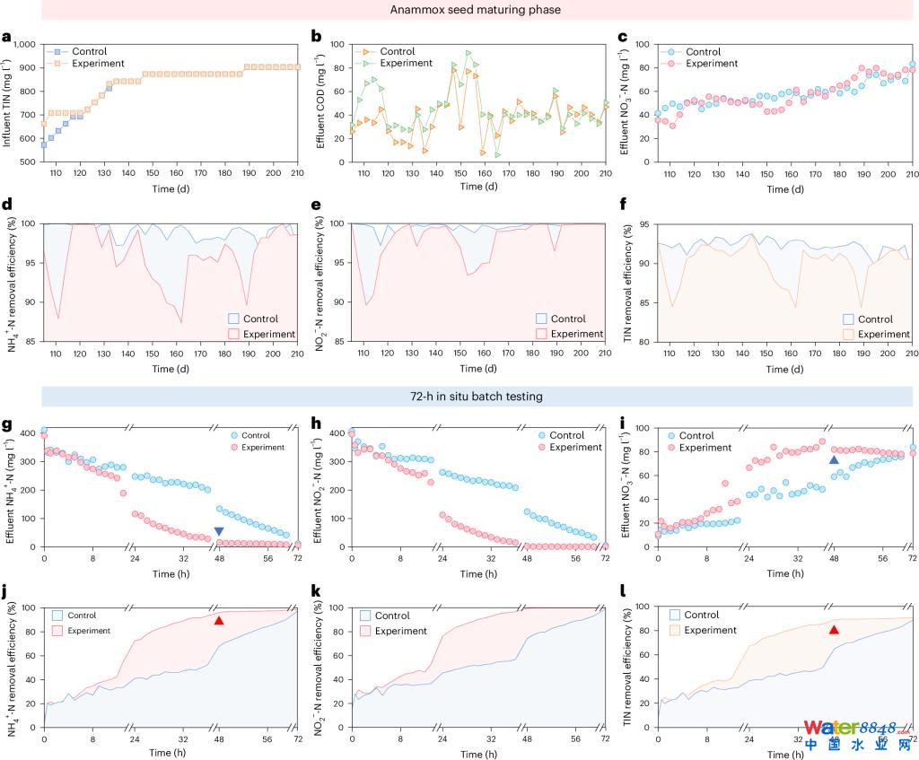 以污水廠厭氧消化污泥為研究對象,設(shè)置了實驗組(前37天進水僅添加硝酸鹽,后續(xù)進水底物切換為銨鹽和亞硝酸鹽)和對照組(進水為銨鹽和亞硝酸鹽反應(yīng)底物,全程未添加硝酸鹽)兩組反應(yīng)器。結(jié)果表明,實施該策略的實驗組在1至15天觀察到明顯的亞硝酸鹽積累現(xiàn)象(圖1d),17天后出水銨鹽和亞硝酸鹽開始同步降低,表明發(fā)生明顯的厭氧氨氧化反應(yīng)(圖1a,d),而對照組在47天后才出現(xiàn)明顯的厭氧氨氧化反應(yīng)(圖1j,k)。隨后,實驗組中觀察到厭氧氨氧化種泥在三個月內(nèi)形成(圖3g),并快速發(fā)育為成熟的厭氧氨氧化污泥(圖3h,i,j),而對照組中未觀察到明顯的厭氧氨氧化種泥形成。穩(wěn)定運行200天后,實驗組和對照組平均總氮去除率均可達到90%以上(圖2f),而72小時沿程實驗結(jié)果表明,實驗組總氮去除速率(kg/m3/d)較對照組提升70%(圖2l)。
