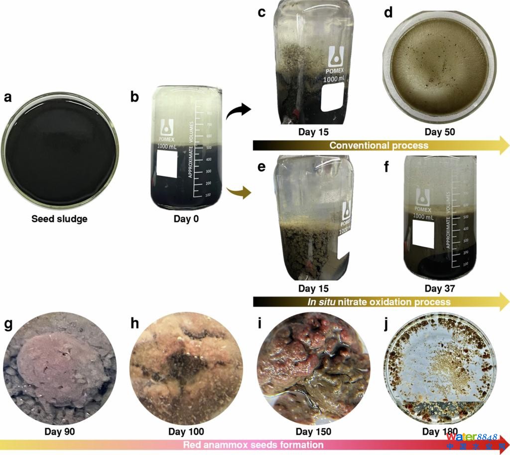 圖4、硝酸鹽驅(qū)動的原位氧化策略機制和污水廠污泥原位升級為厭氧氨氧化種泥路線
