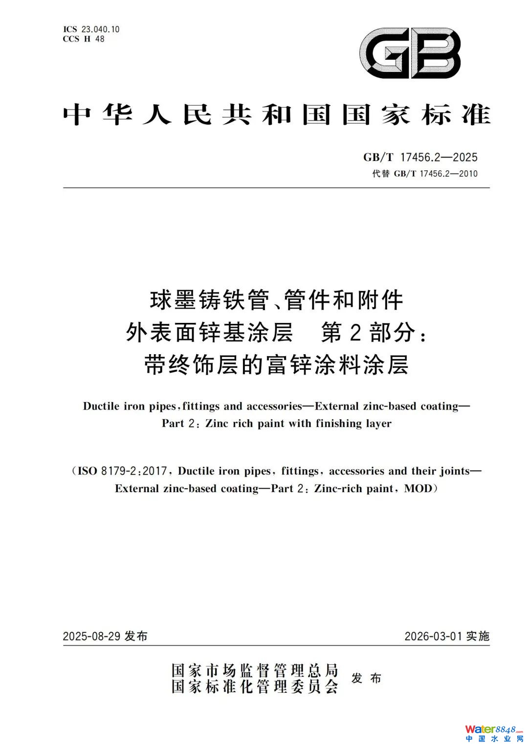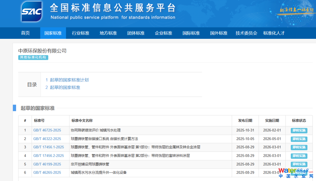 2025年以來,中原環(huán)保參與編制的6項(xiàng)國家標(biāo)準(zhǔn)陸續(xù)發(fā)布,包括《城鎮(zhèn)雨水污水分流提升井一體化設(shè)備》(GB/T 46265-2025)、《非開挖鋪設(shè)用球墨鑄鐵管》(GB/T 46199-2025)、《球墨鑄鐵管自錨接口系統(tǒng) 自錨長度計(jì)算方法》(GB/T 46322-2025)、《球墨鑄鐵管、管件和附件外表面鋅基涂層 第1部分:帶終飾層的金屬鋅及鋅合金涂層》(GB/T 17456.1-2025)、《球墨鑄鐵管、管件和附件外表面鋅基涂層 第2部分:帶終飾層的富鋅涂料涂層》(GB/T 17456.2-2025)。以上標(biāo)準(zhǔn)分別由全國城鎮(zhèn)給水排水標(biāo)準(zhǔn)化技術(shù)委員會、全國鋼標(biāo)準(zhǔn)化技術(shù)委員會歸口管理,為城鎮(zhèn)排水系統(tǒng)的優(yōu)化升級提供了重要的技術(shù)支撐。